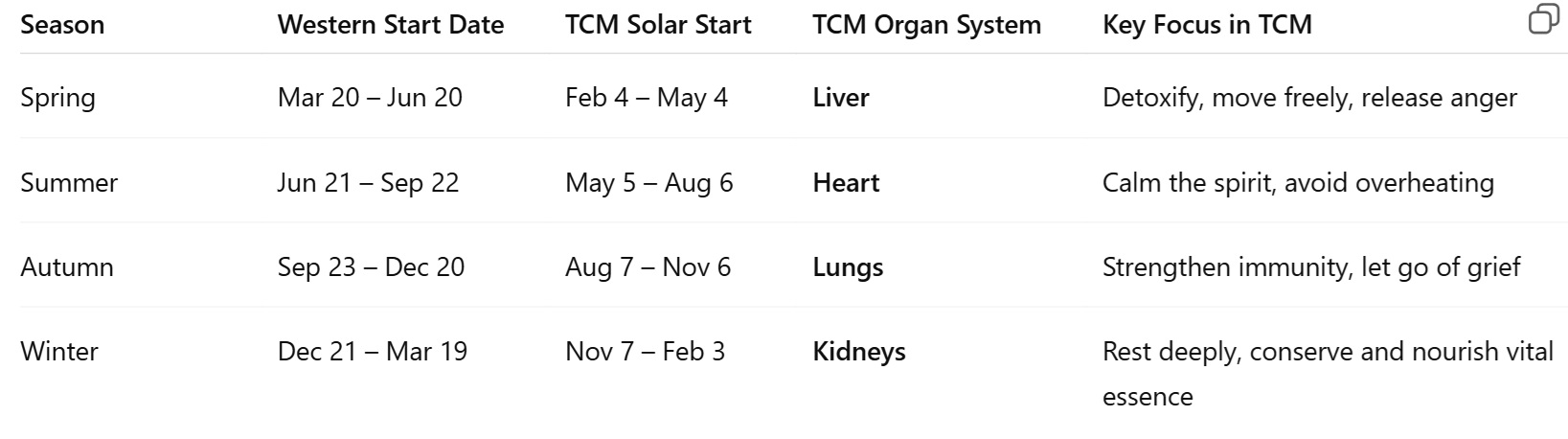 Each season still spans approximately three months, but starts earlier than what the Western calendar suggests. This shift matters deeply—because in TCM, each season governs specific internal organs, emotions, and elemental energies in the body.